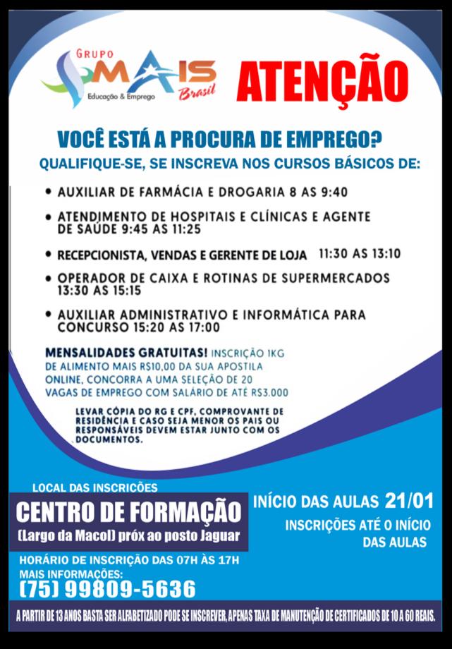 Reconhecida com um projeto que mais coloca alunos no mercado de trabalho a empresa MAIS BRASIL traz diversos cursos de capacitação profissional para Itaberaba, no Centro de Formação Profissional, no Largo da Macol, próximo ao posto Jaguar, com aulas somente aos sábados, os interessados não pagarão mensalidade e somente a taxa de certificados que tem o valor entre R$ 10 e $ 60 e garantem seu certificado de 40h/