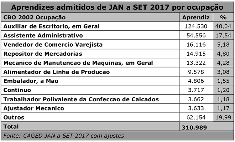 Os setores que registram o maior índice de contratações são o da Indústria da Transformação, com 82.762 aprendizes contratados (26,61%); o Comércio, com 74.576 postos de trabalho (23,98%), e a área de Saúde Humana e Serviços Sociais, com a contratação de 35.903 aprendizes (11,54). Quando considerados os dados de ocupação, verifica-se a predominância de contratação de aprendizes na função de auxiliar de escritório, com 124.530 contratados (40,04%) e assistente administrativo, com 54.556 aprendizes (17,54%), seguidos por vendedor de comércio varejista, com 16.116 postos ocupados (5,18%).