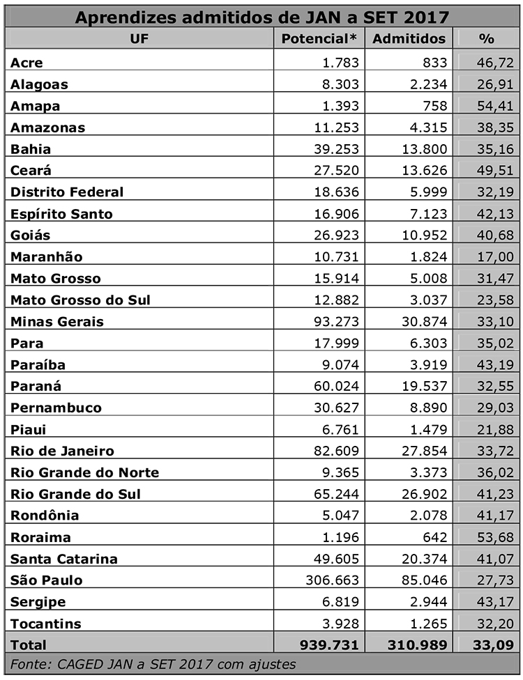 A lei da Aprendizagem Profissional proporcionou o ingresso de mais de 310 mil jovens no mercado de trabalho em 2017. Um balanço apresentado pelo Ministério do Trabalho aponta a admissão de 310.989 trabalhadores na condição de aprendizes, entre janeiro e setembro deste ano. O estado que mais contratou foi São Paulo, seguido de Minas Gerais, Rio de Janeiro, Rio Grande do Sul e Santa Catarina.