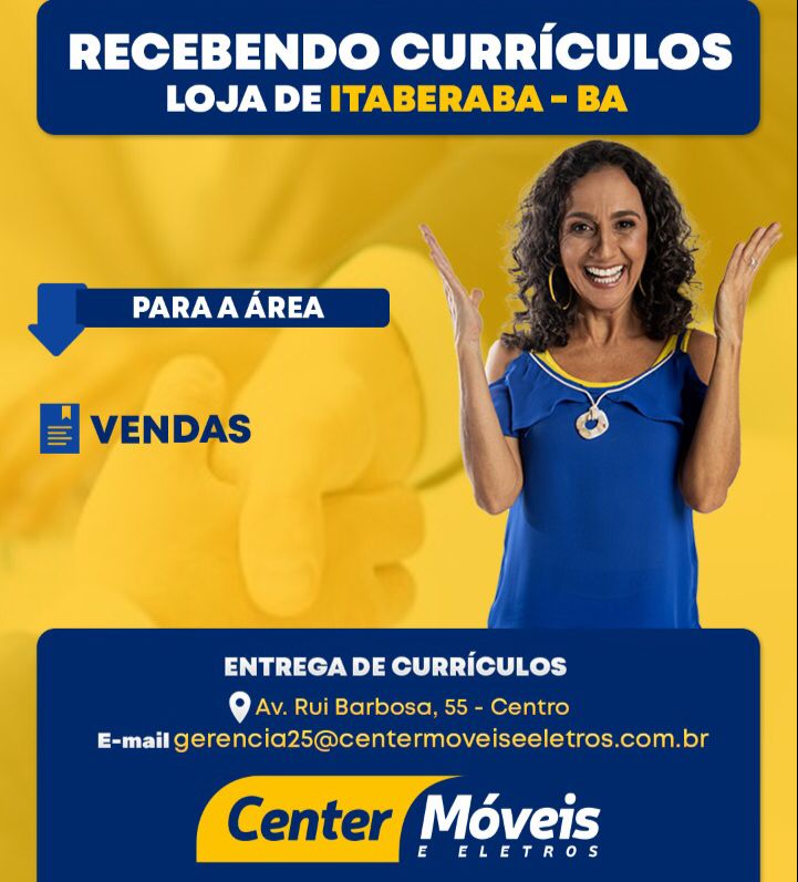 A rede de lojas Center Móveis e Eletros está com inscrições abertas em novo processo seletivo que vira preencher vaga disponível na área de Vendas, na unidade de Itaberaba.