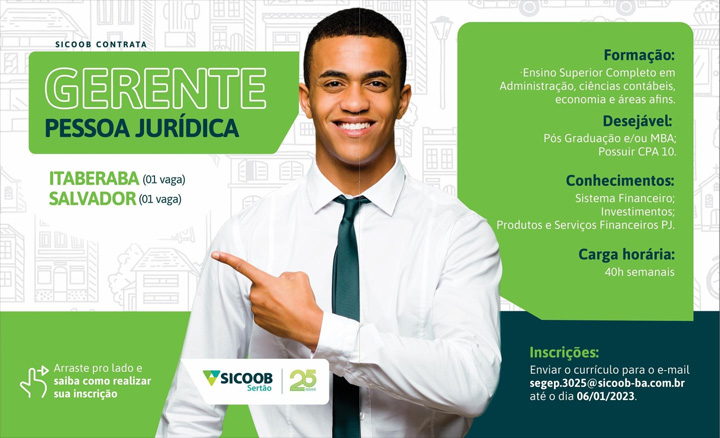 O Sicoob está com oportunidades de emprego disponíveis para Gerente Pessoa Jurídica, em Salvador e Itaberaba.