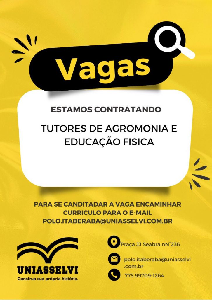 A Uniasselvi está recebendo currículos, no Polo de Itaberaba, para a contratação de Tutores de Agronomia e Educação Física.