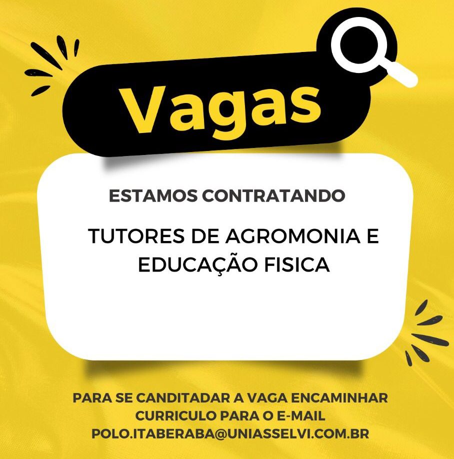 A Uniasselvi está recebendo currículos, no Polo de Itaberaba, para a contratação de Tutores de Agronomia e Educação Física.